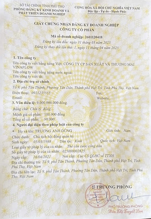 Giấy chứng nhận đăng ký doanh nghiệp công ty cổ phầnTác giảVinaflow15:31 - 31/12/2025GIẤY CHỨNG NHẬN ĐĂNG KÝ DOANH NGHIỆP CÔNG TY CP SẢN XUẤT VÀ THƯƠNG MẠI VINAFLOW Chia sẻ: